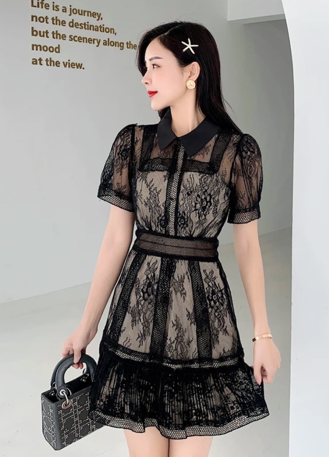 ブラックシースルーフワラーレースミニワンピース