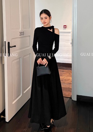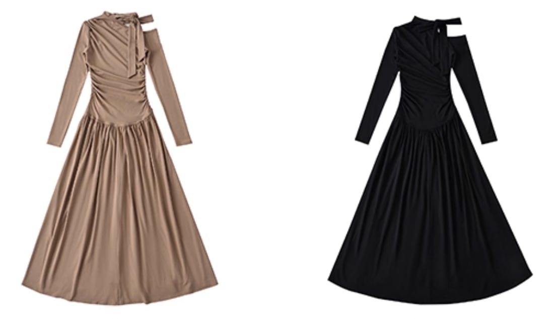 【動画あり】アシンメトリーカットリボン切り替えフレアワンピース 2色展開
