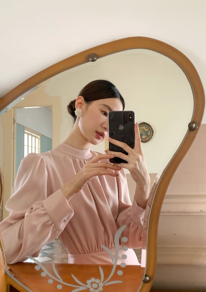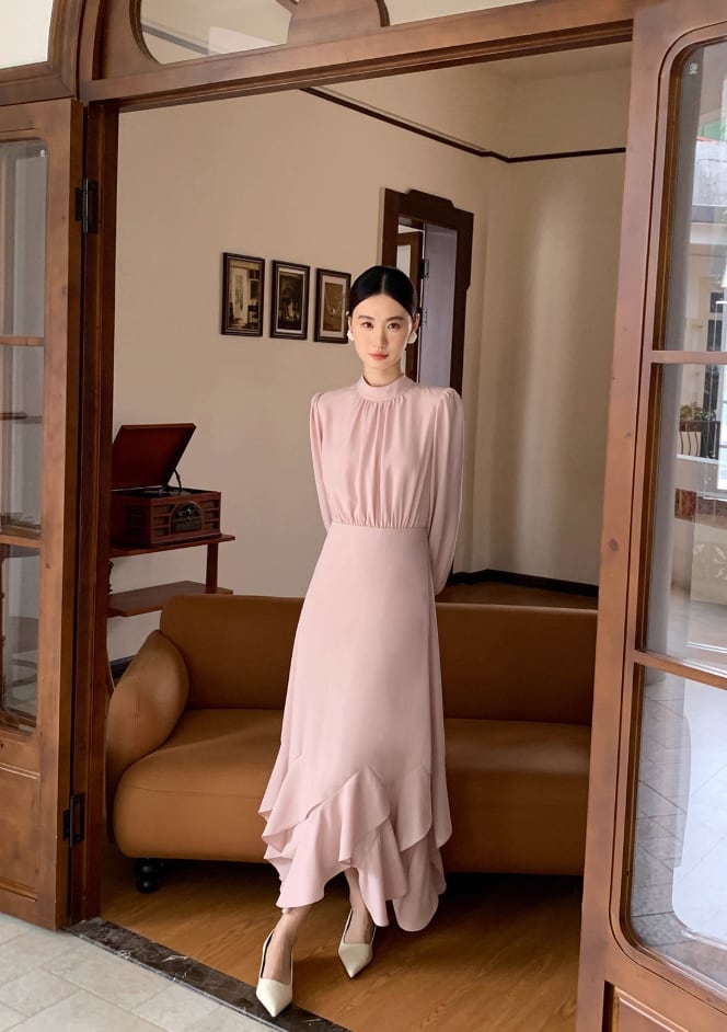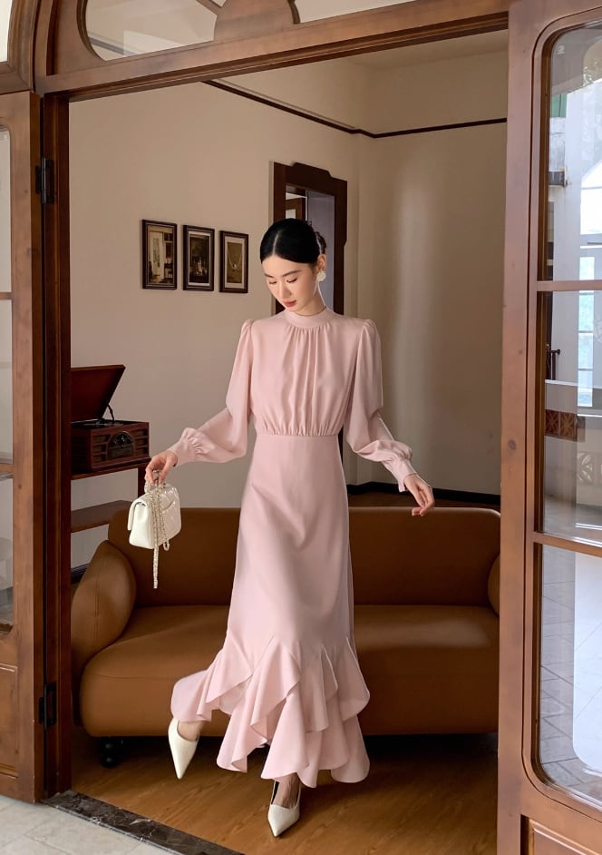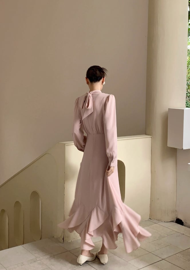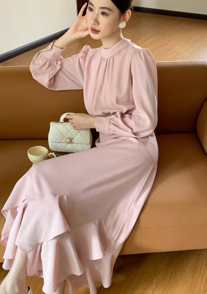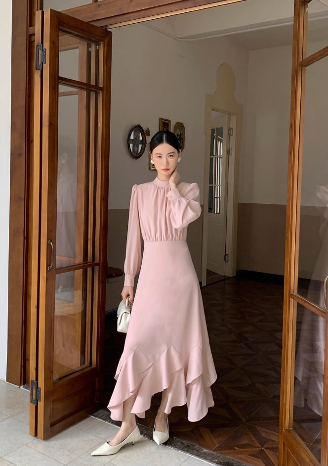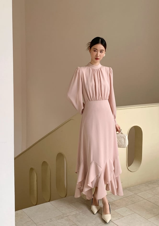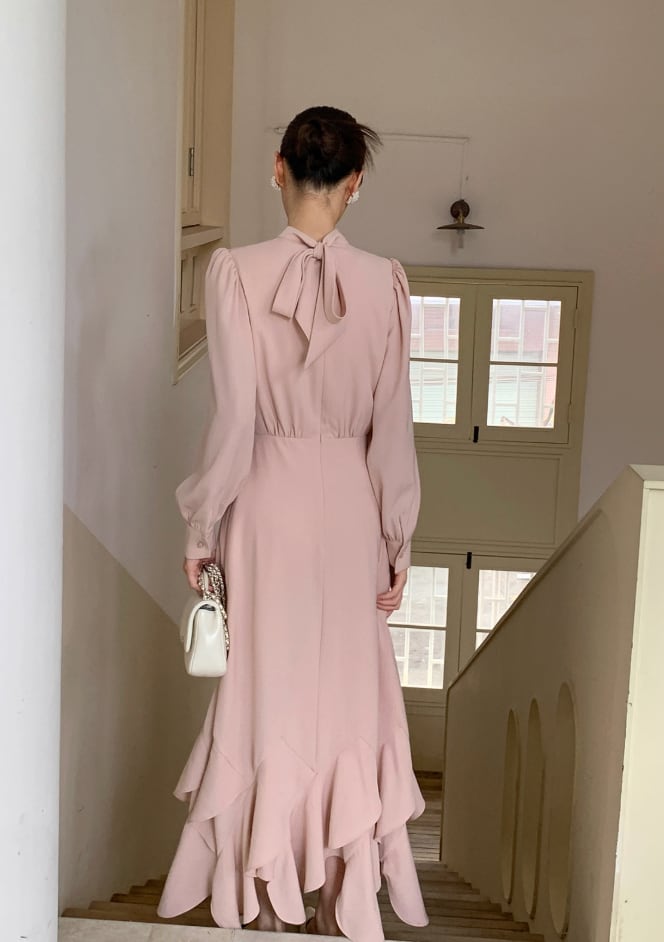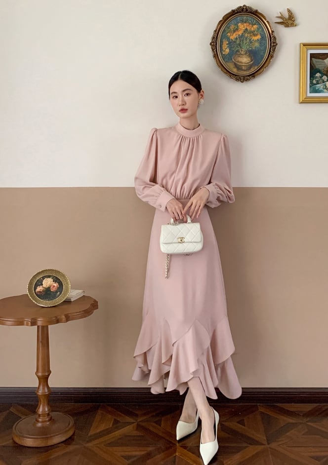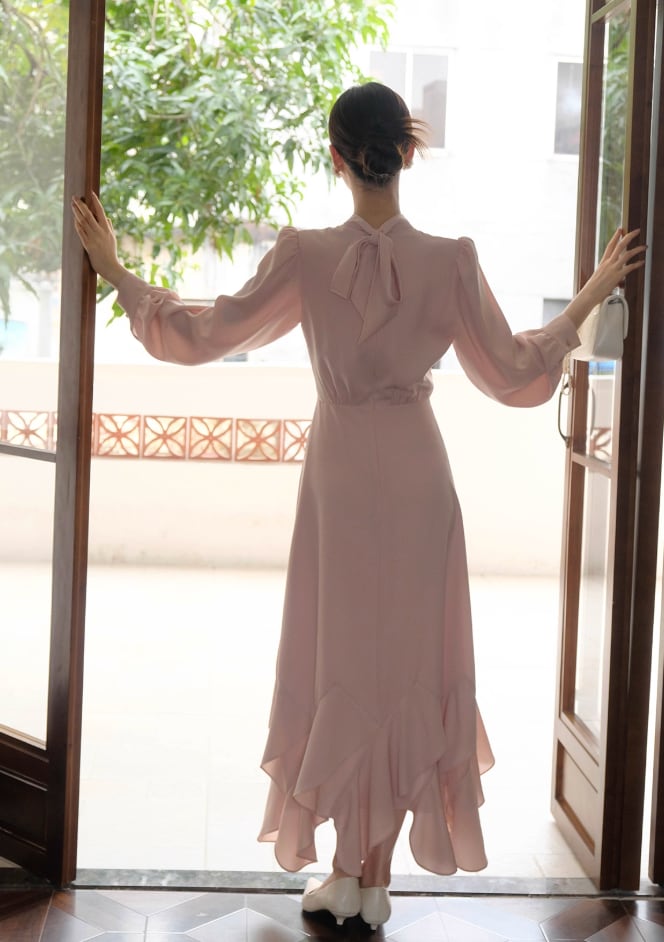 【動画あり】エレガントフリルパウダーピンクワンピース