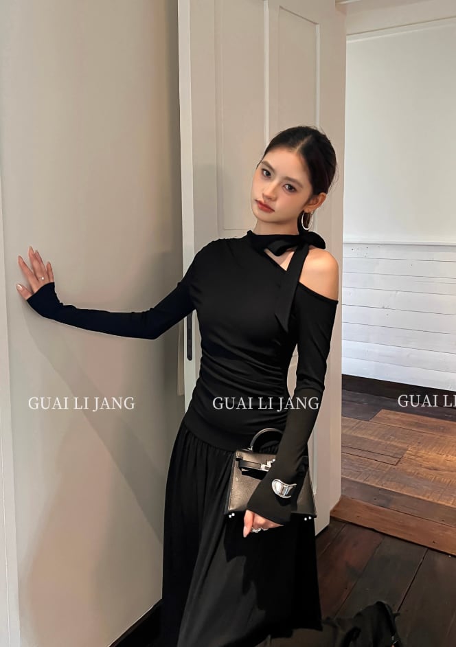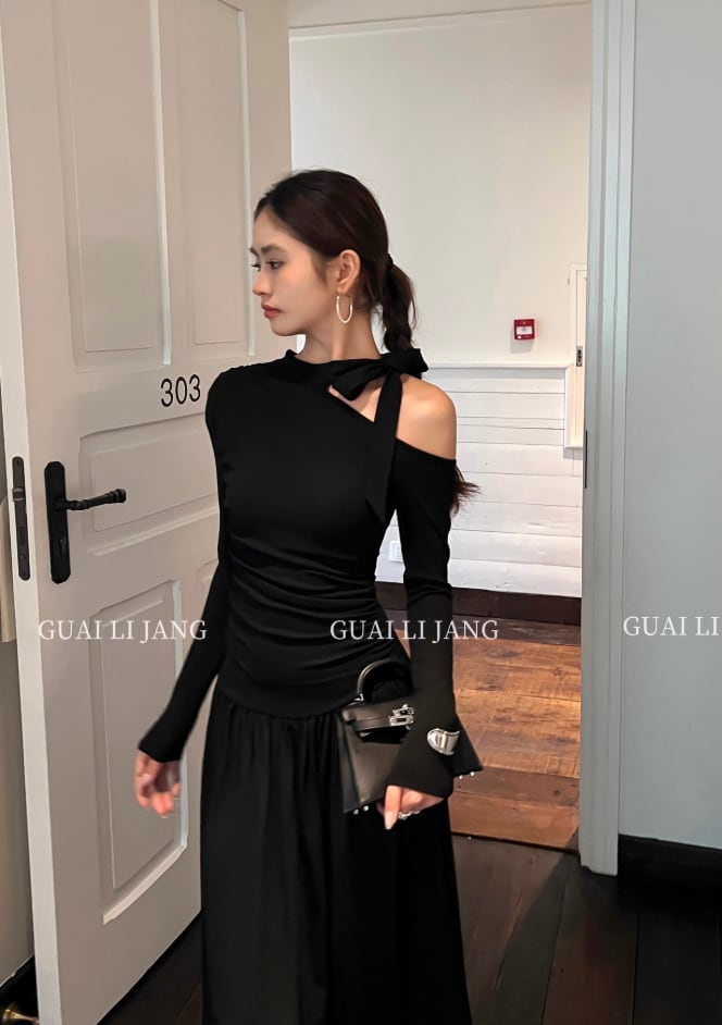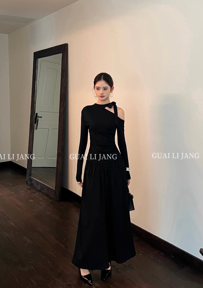 即納在庫セール専用<ブラックM>【動画あり】アシンメトリーカットリボン切り替えフレアワンピース 2色展開