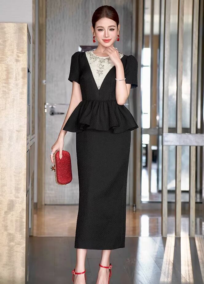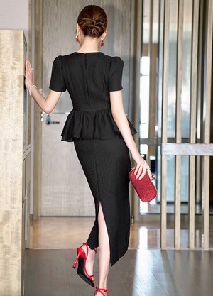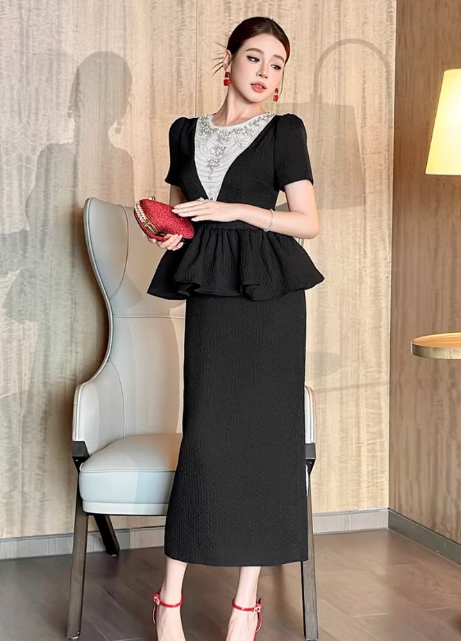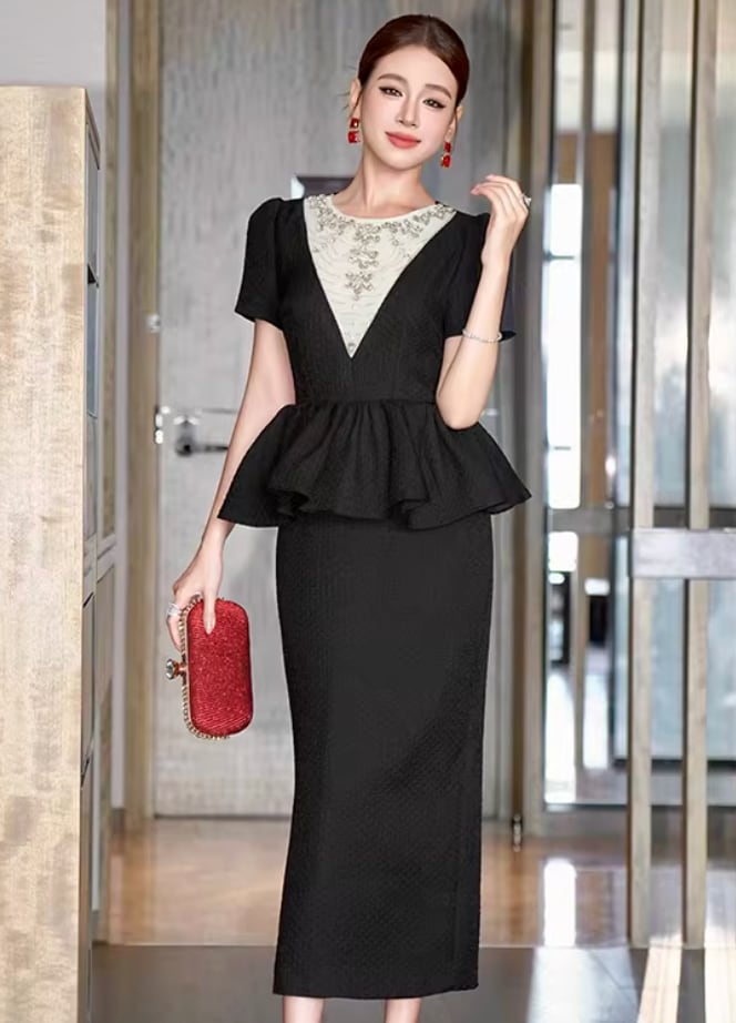 【動画あり】バイカラー切り替えビジューペプラムドレス