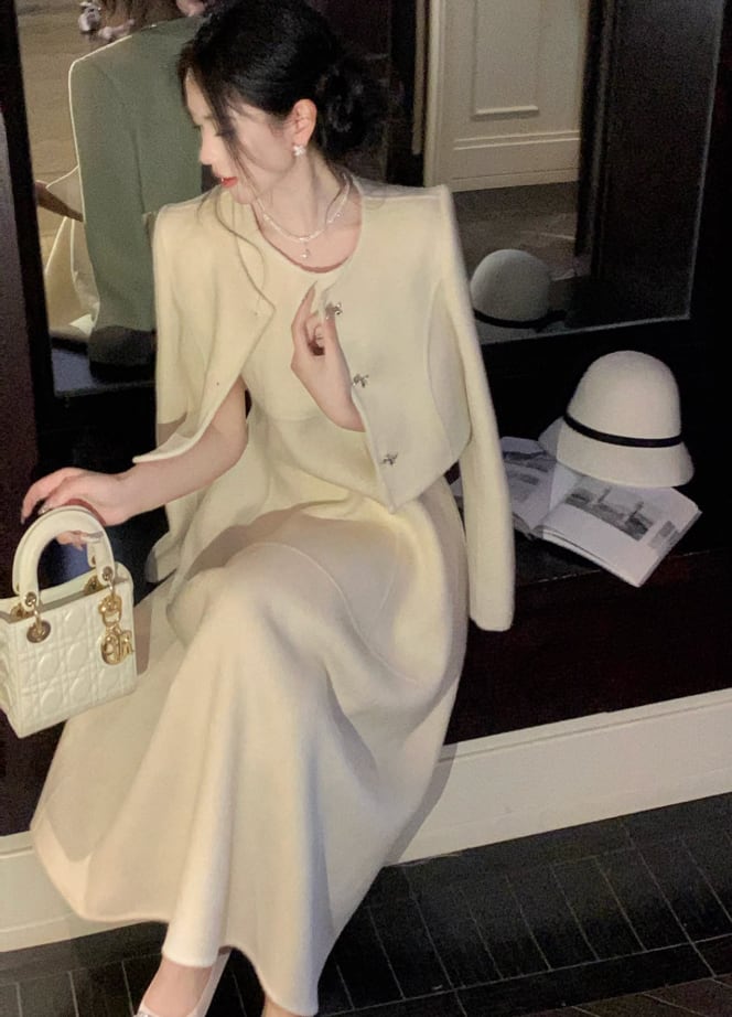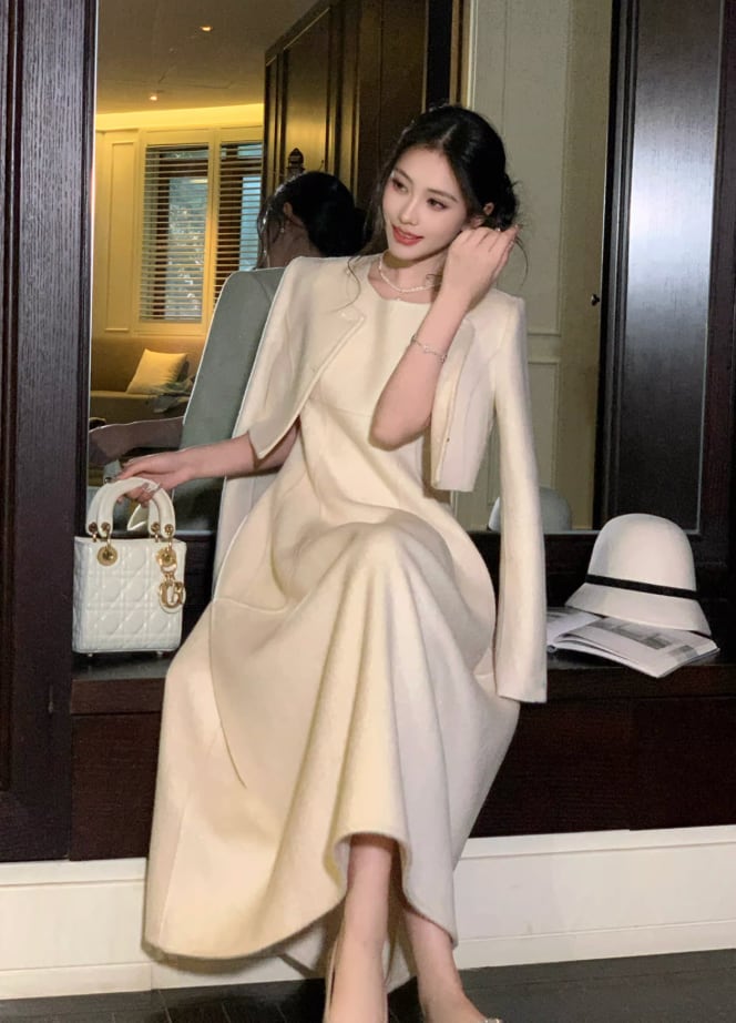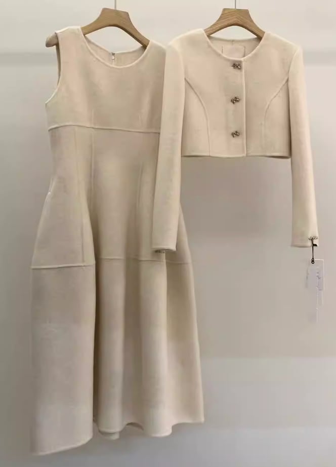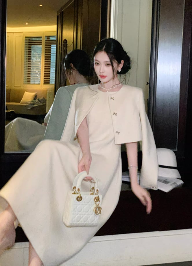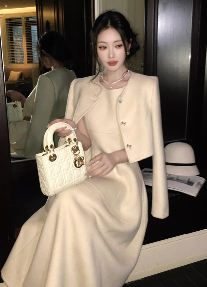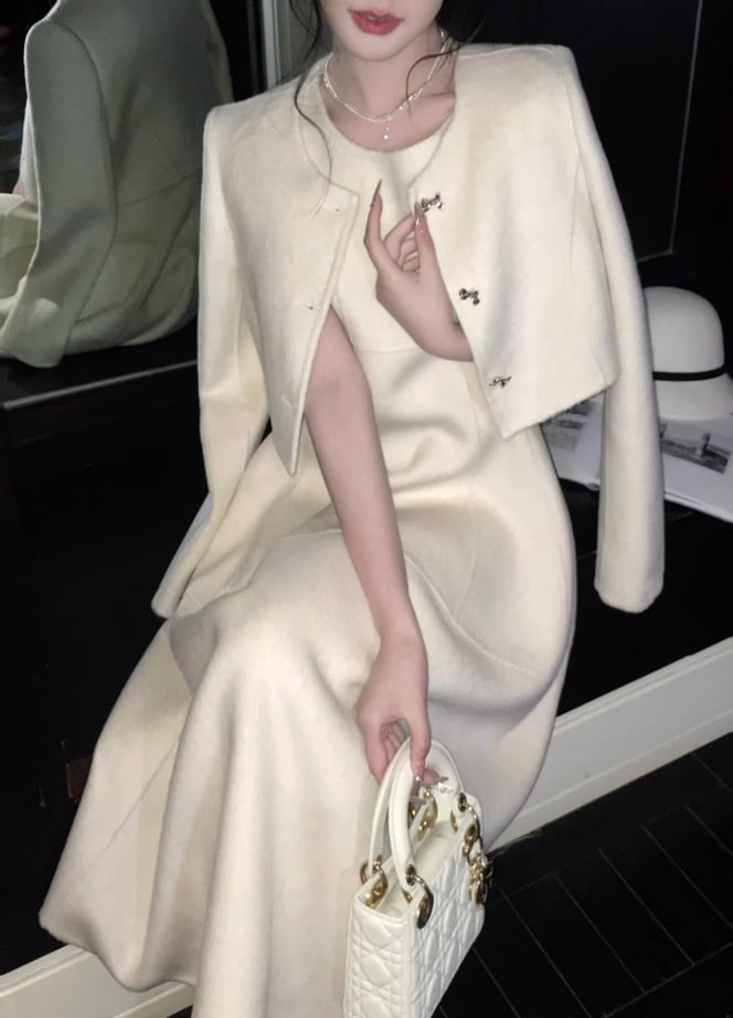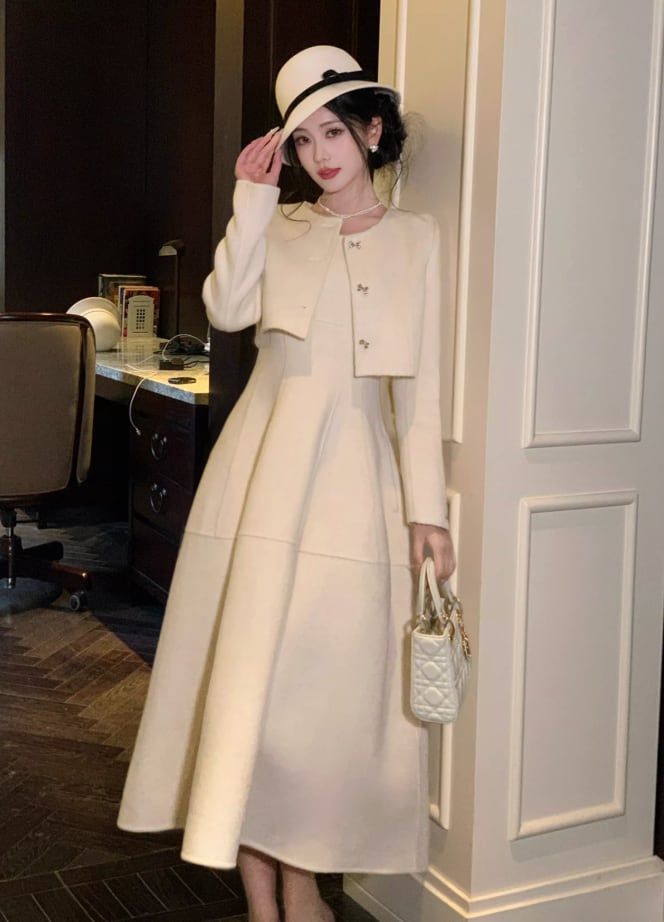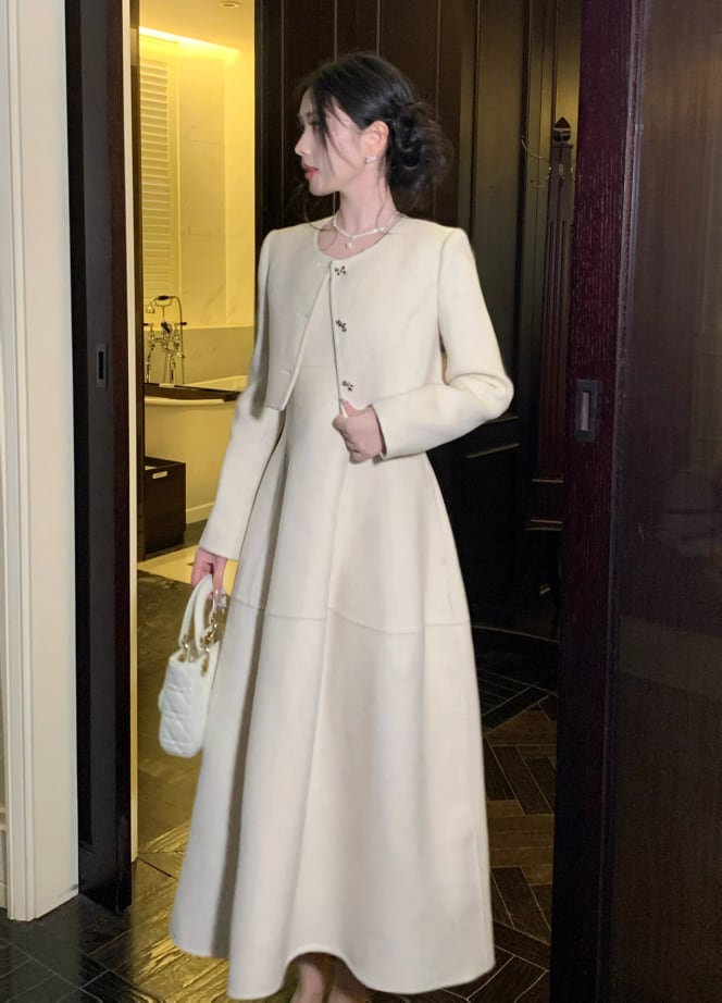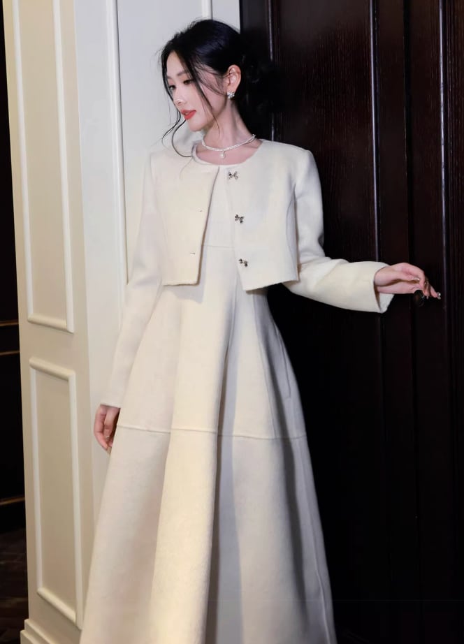 <ピュアウール100%>上品ノーカラージャケット&美ラインワンピース セットアップ