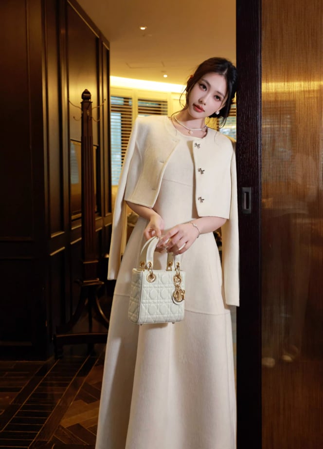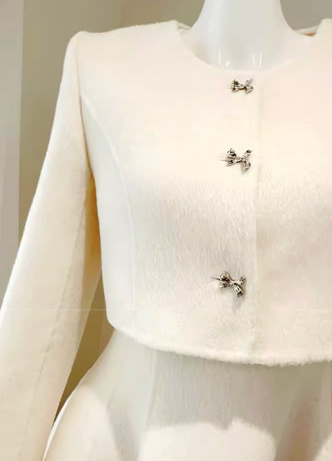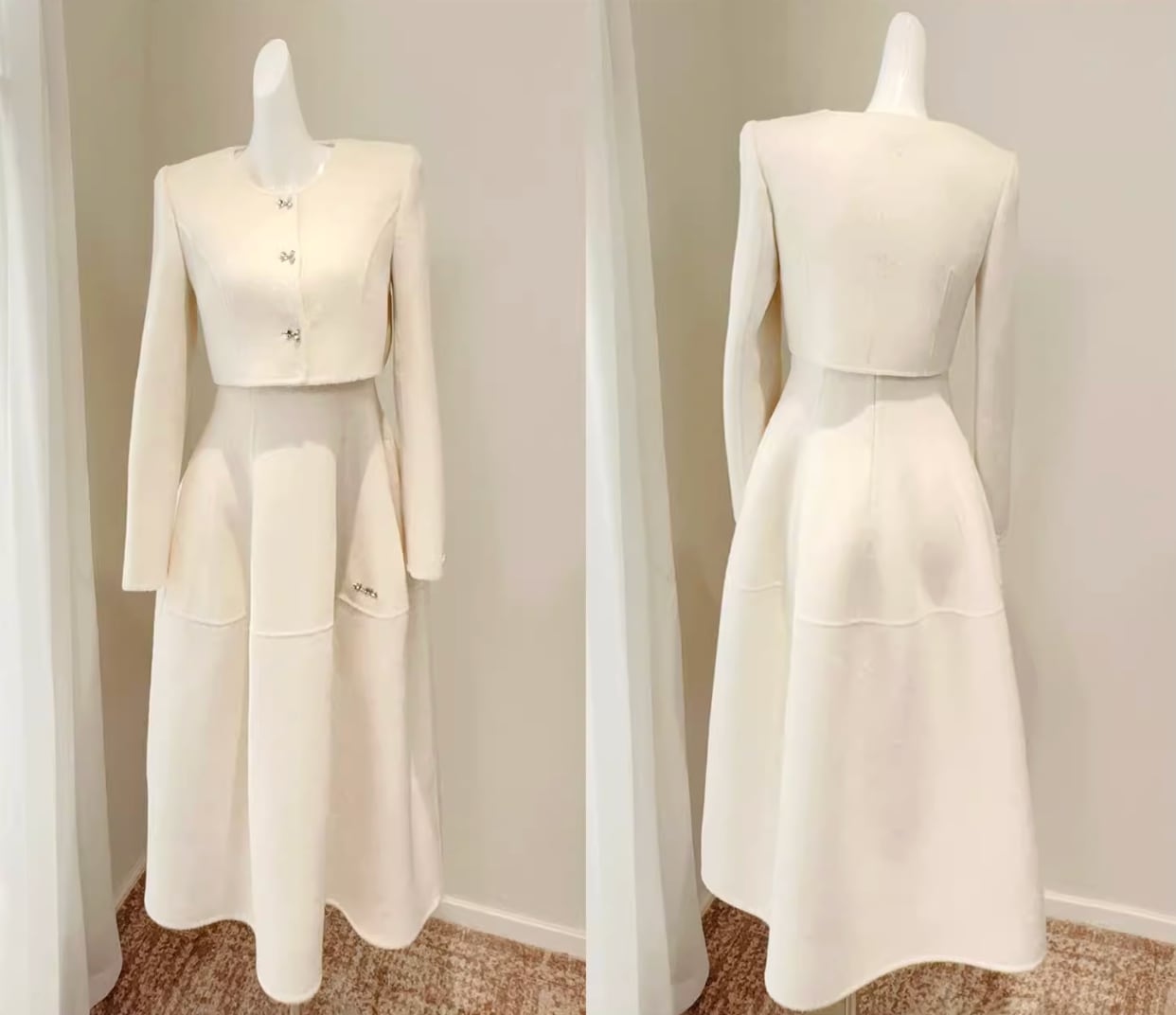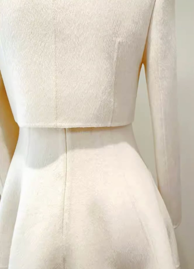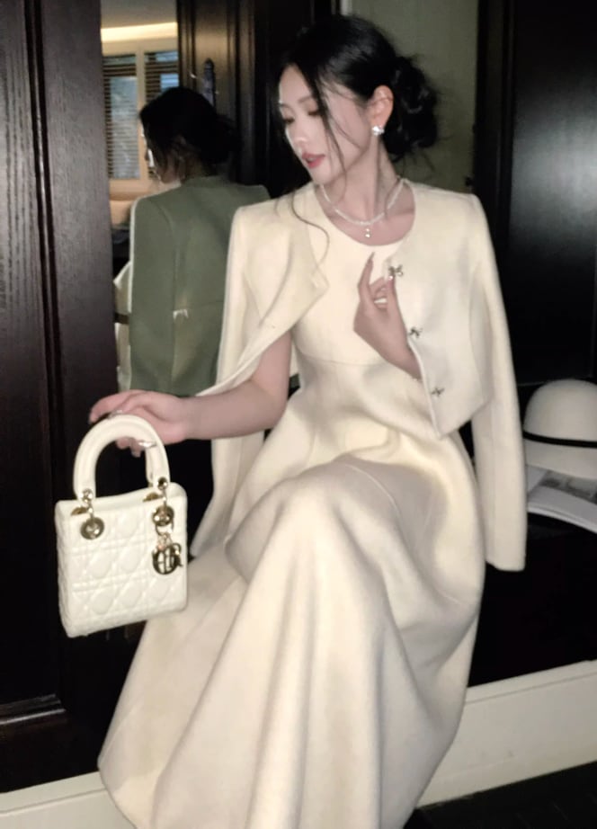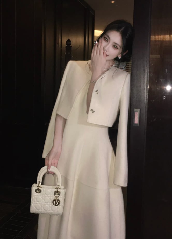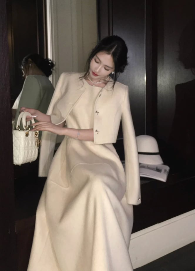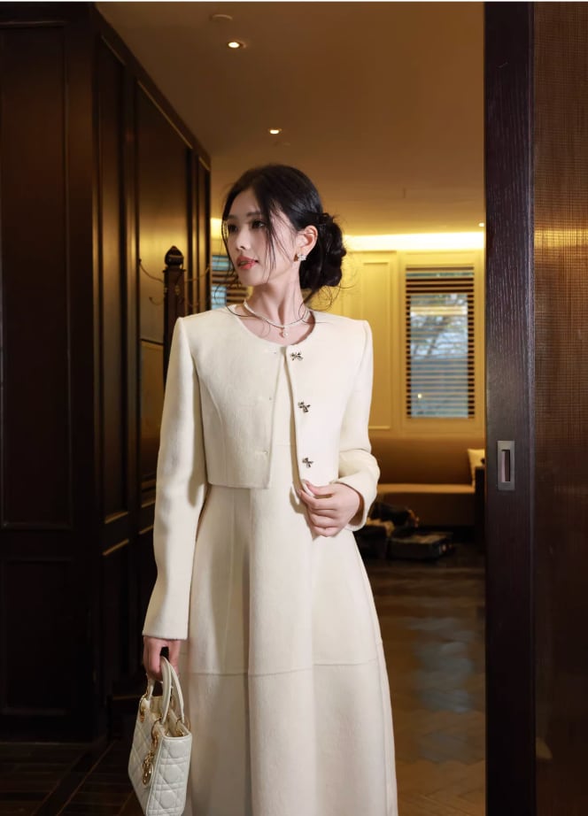 <ピュアウール100%>上品ノーカラージャケット&美ラインワンピース セットアップ