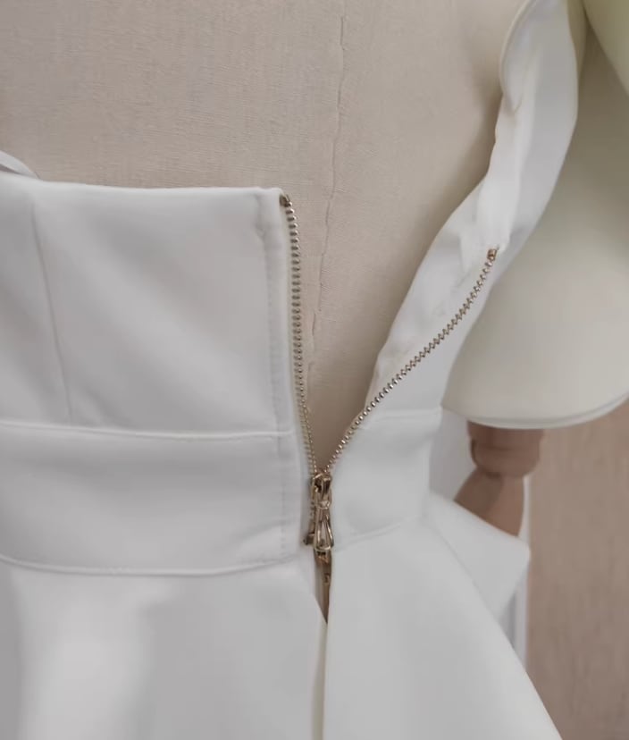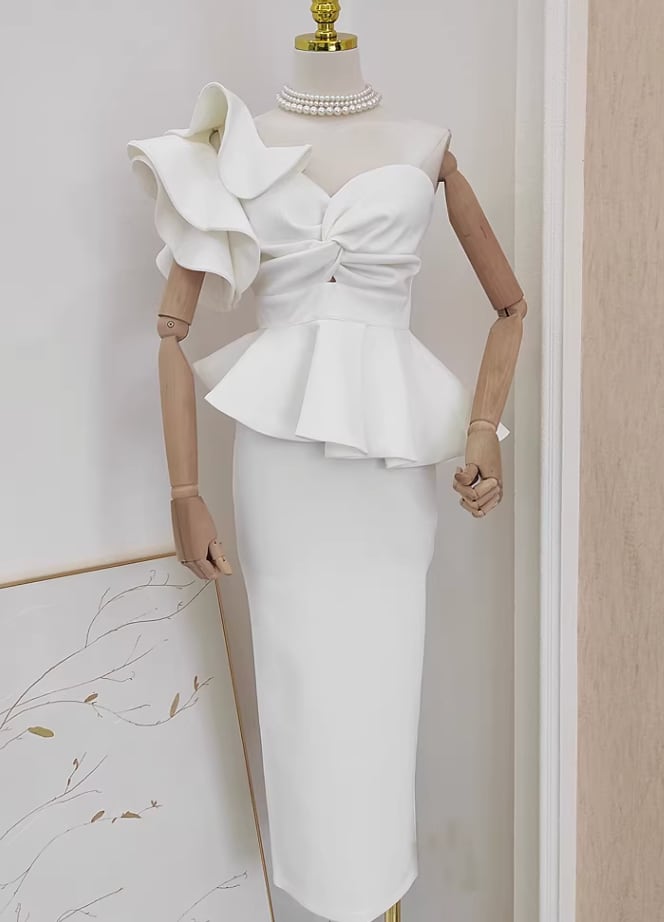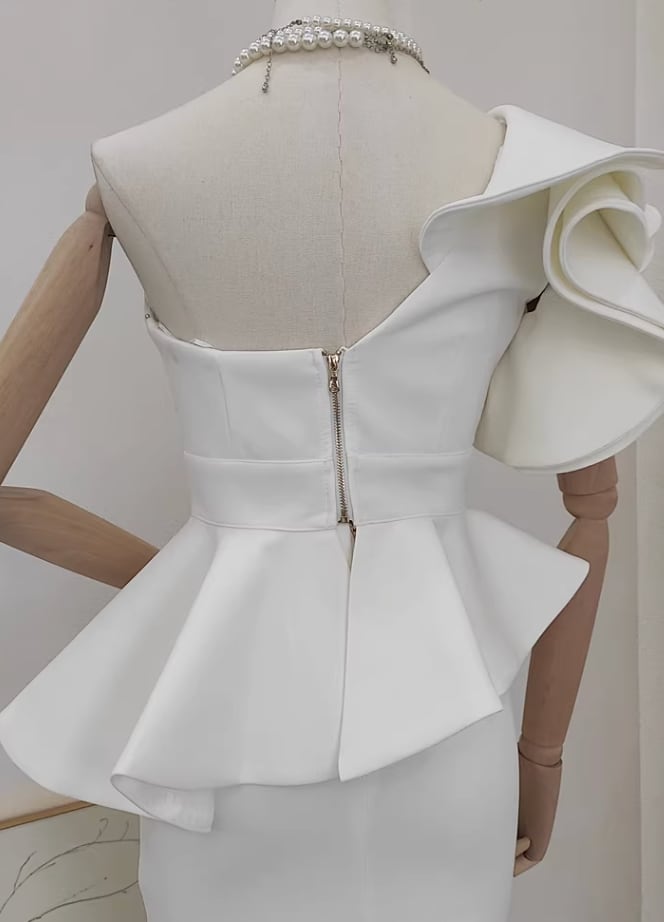 ワンショルダーフリル上質ホワイトペプラムセットアップ