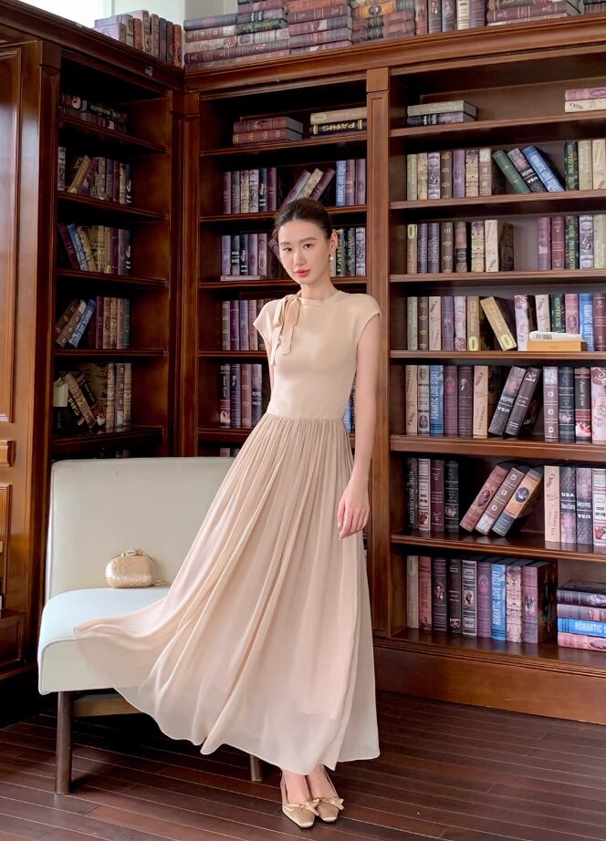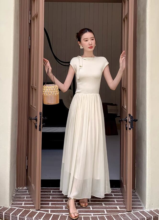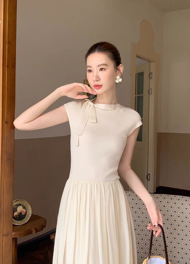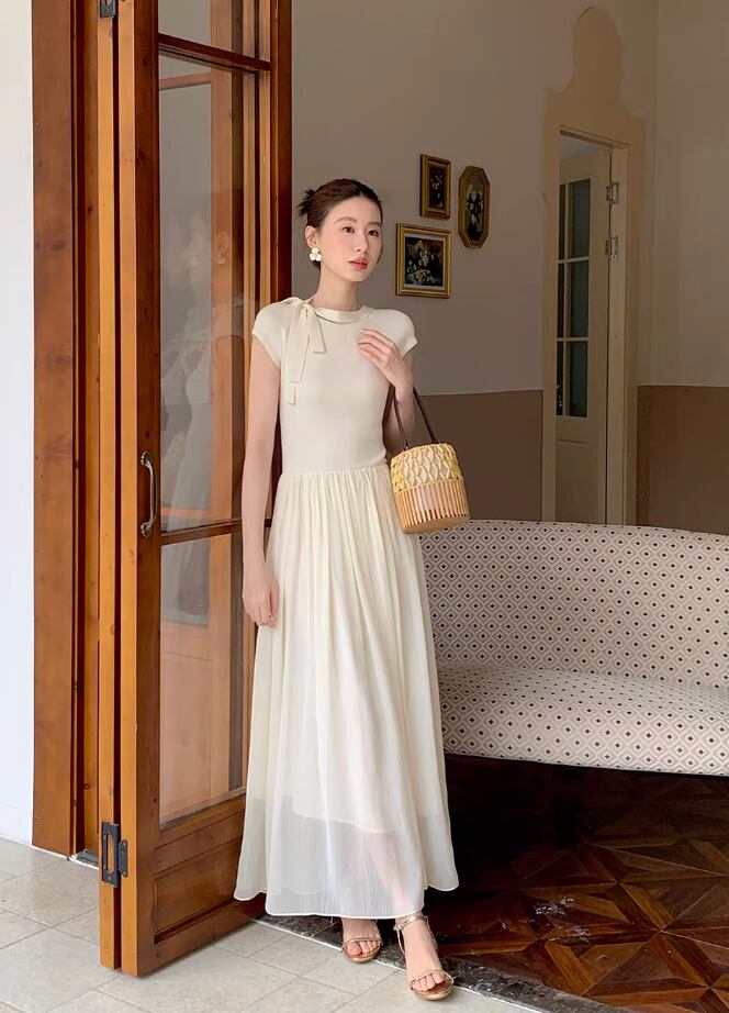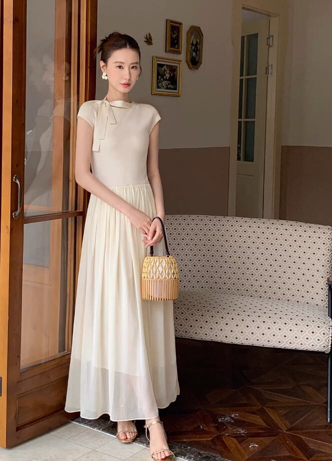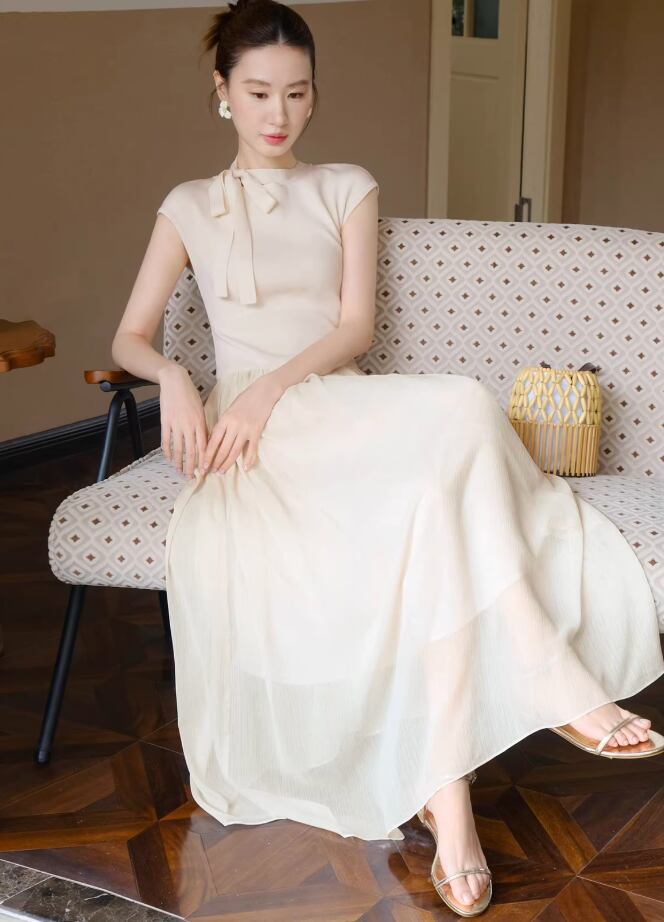 【動画あり】ネックリボンクリームシフォンナチュラルワンピース 2色展開