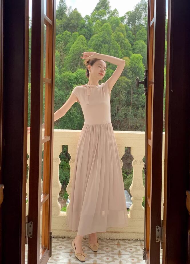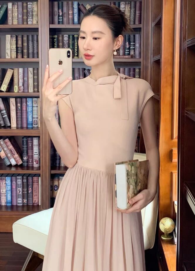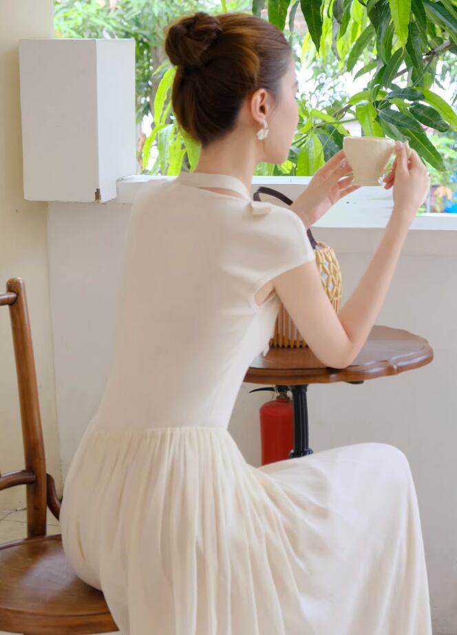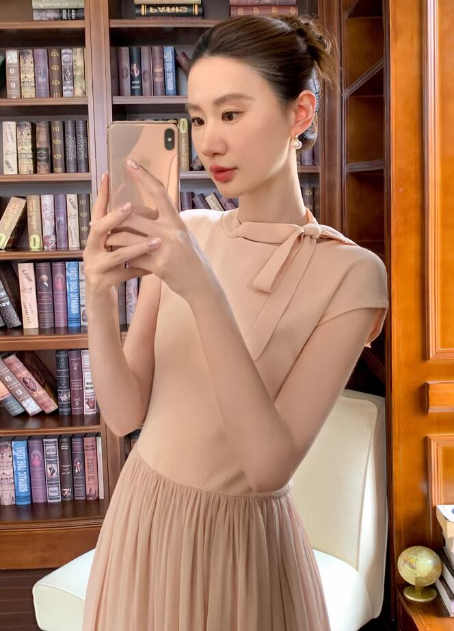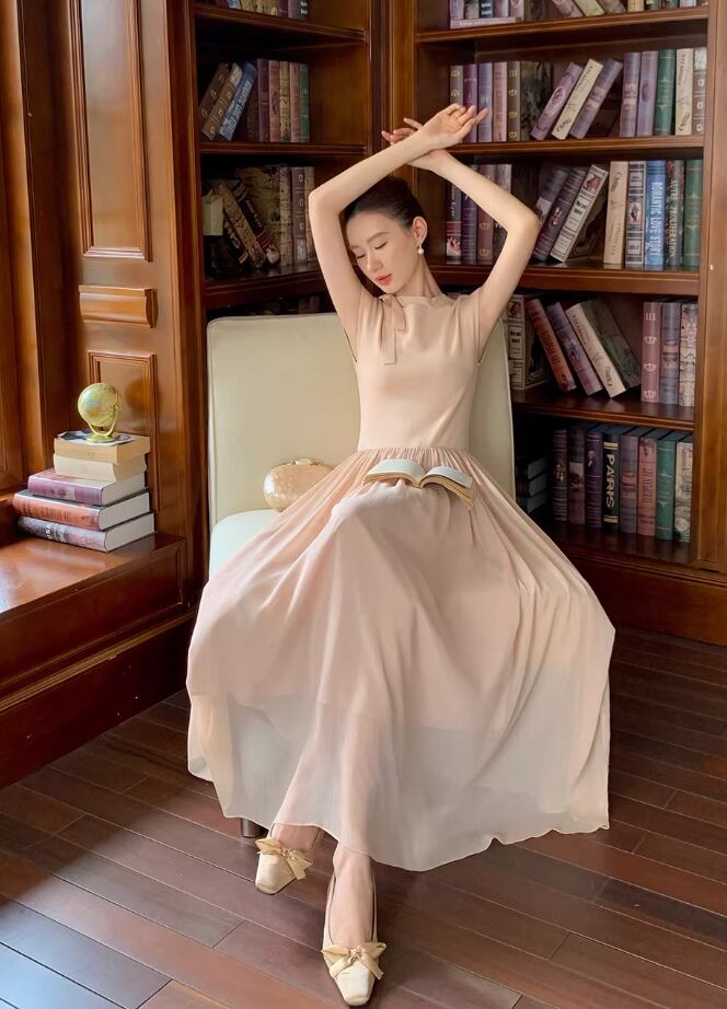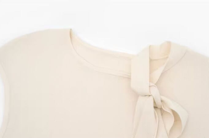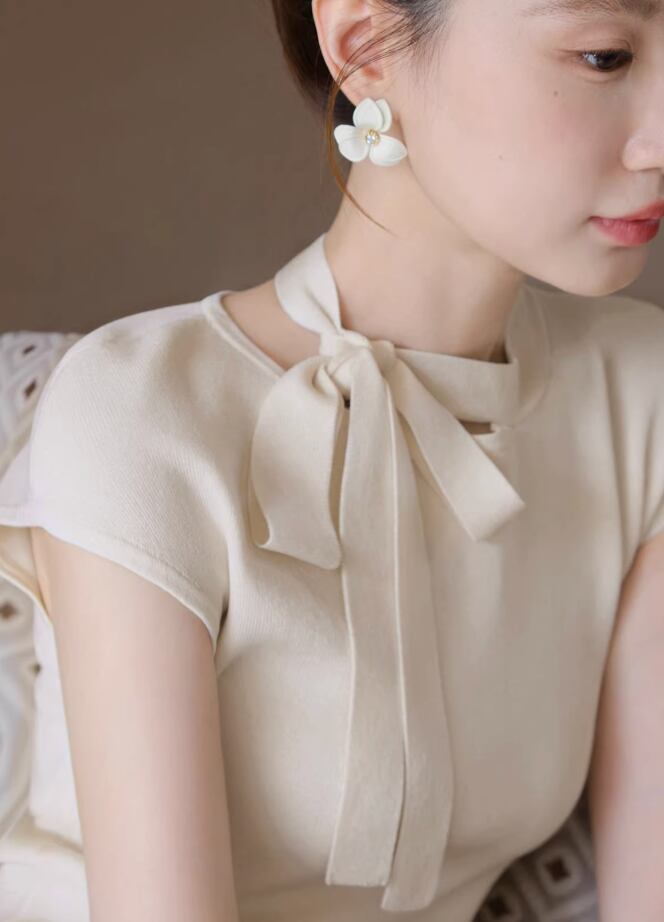 【動画あり】ネックリボンクリームシフォンナチュラルワンピース 2色展開