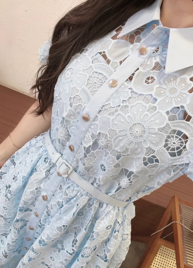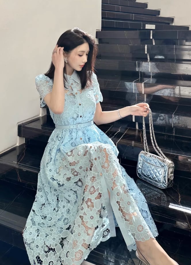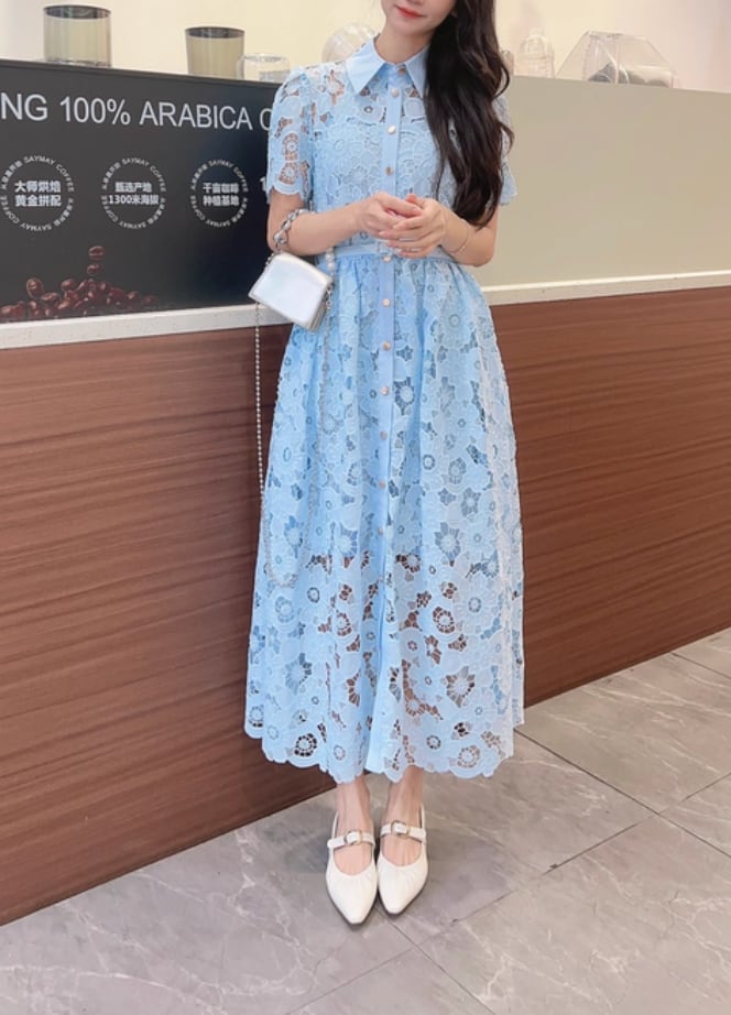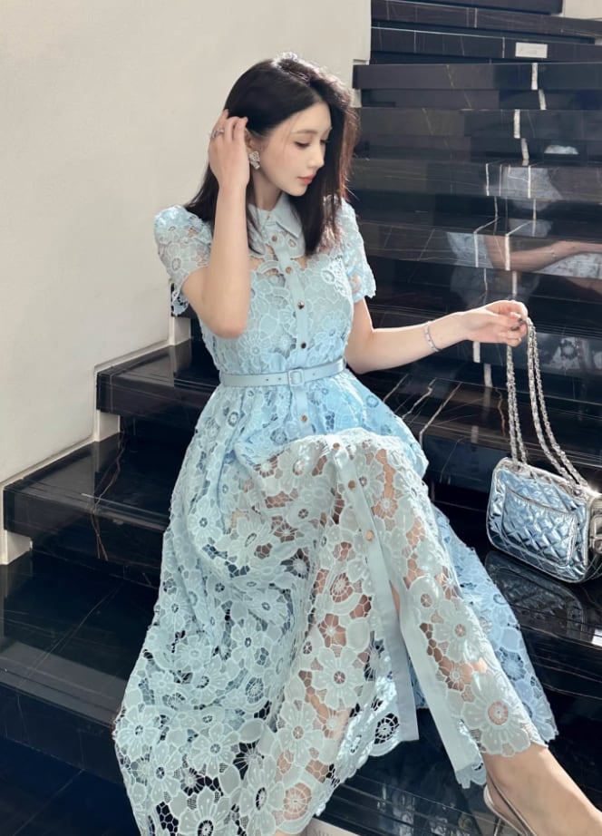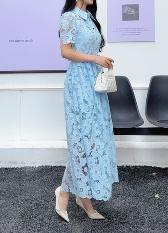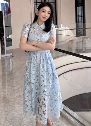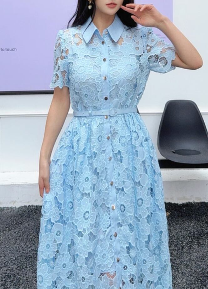【動画あり】アイスブルーフラワー総レースドレス