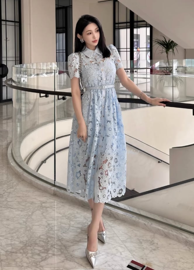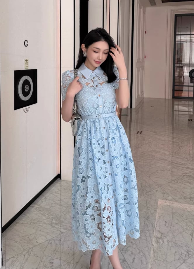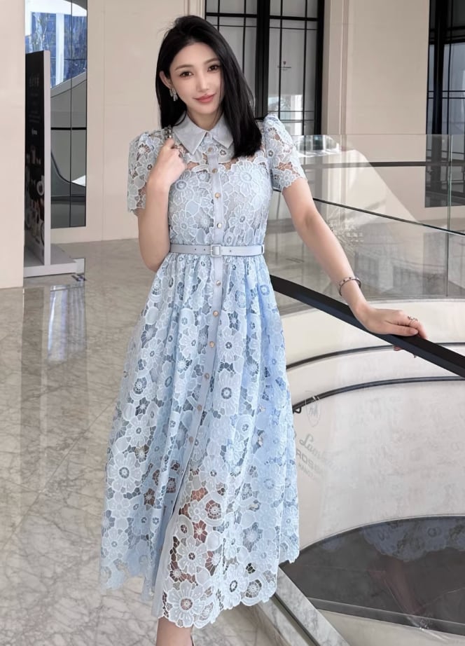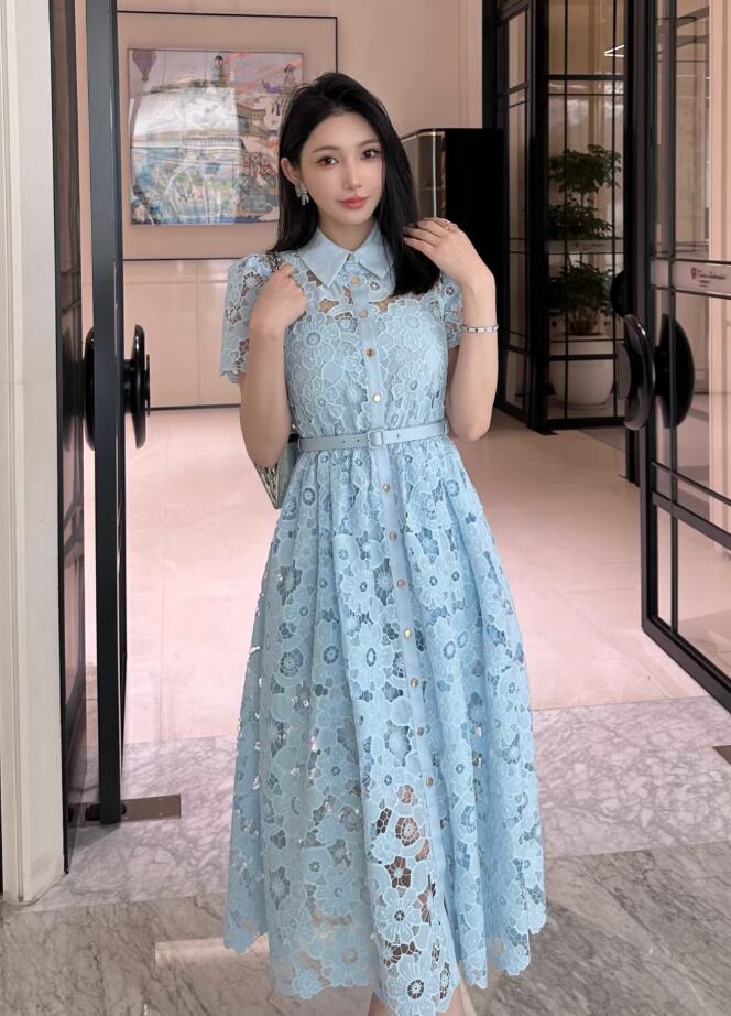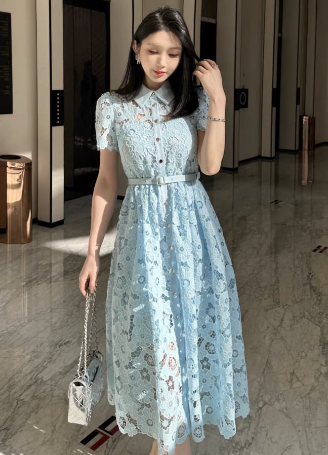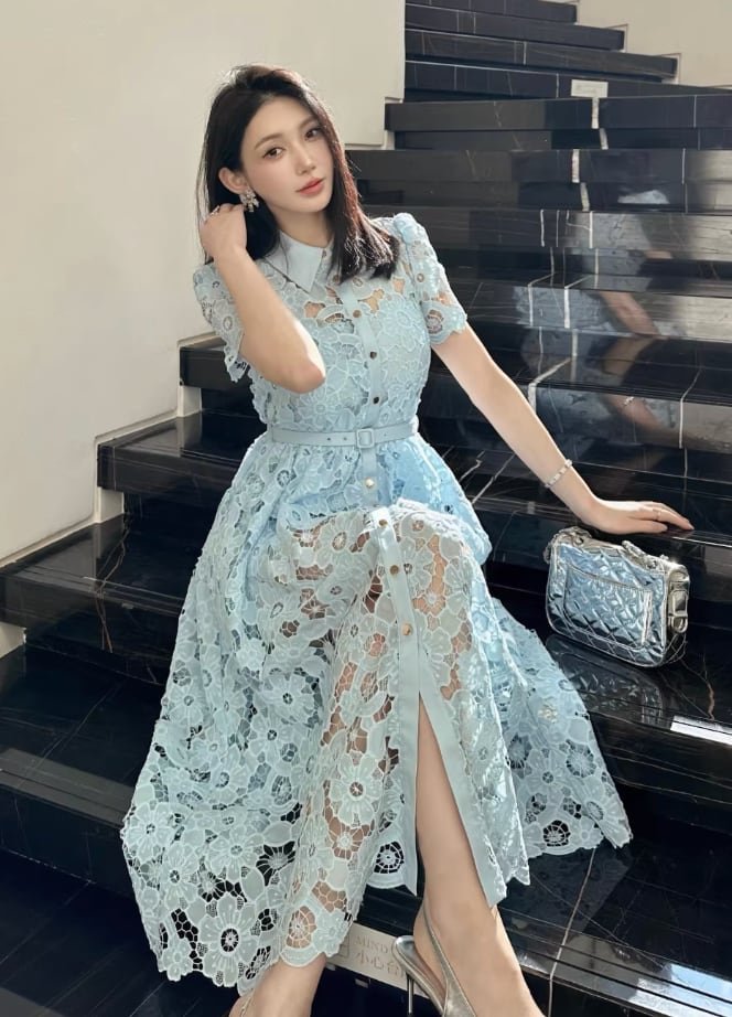 【動画あり】アイスブルーフラワー総レースドレス
