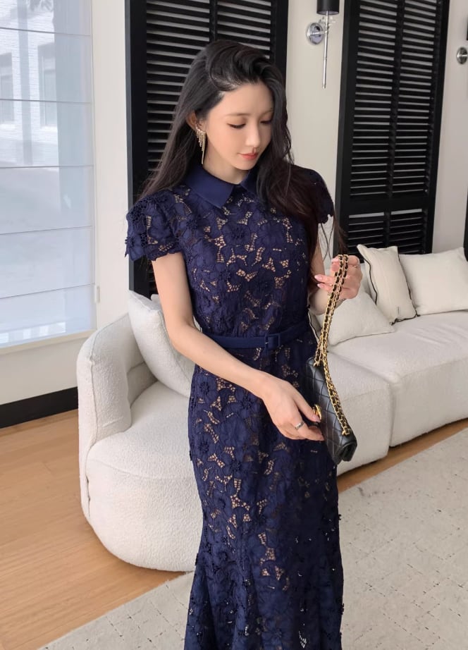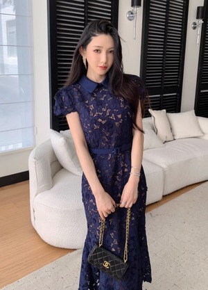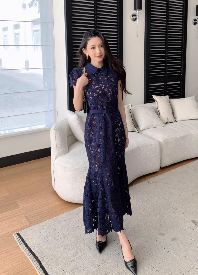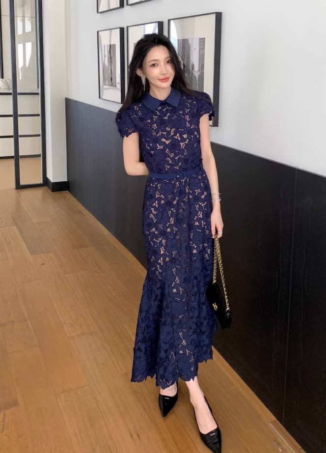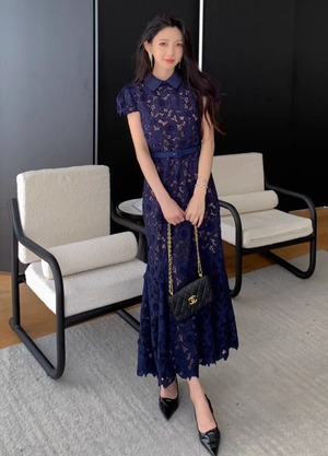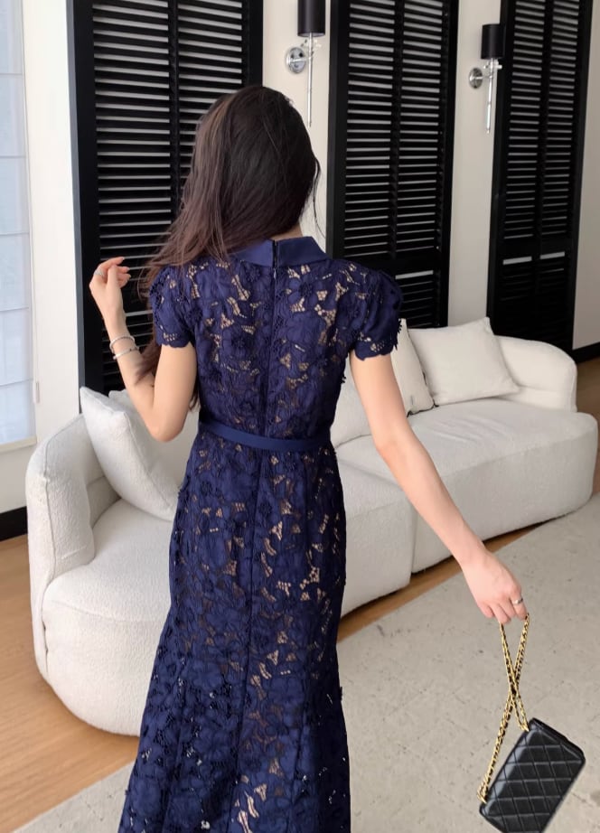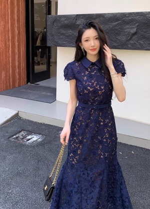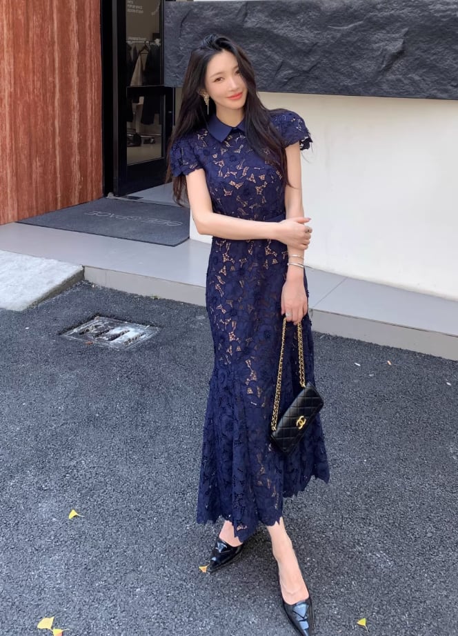 【動画あり】ネイビーブルーフィッシュテール上品フラワードレス