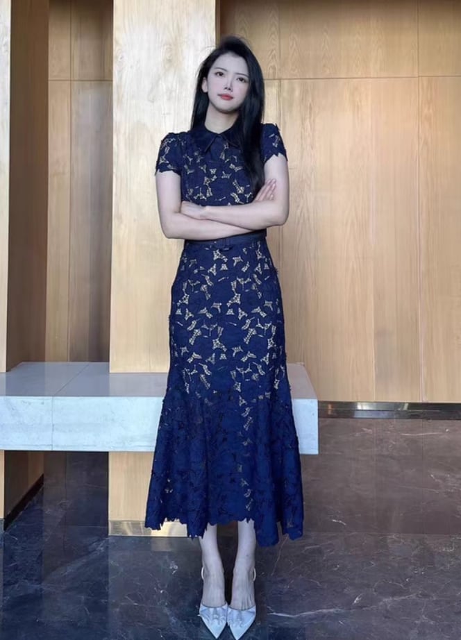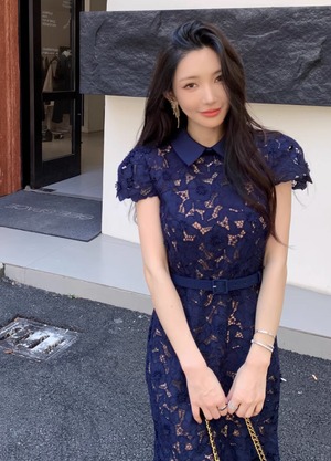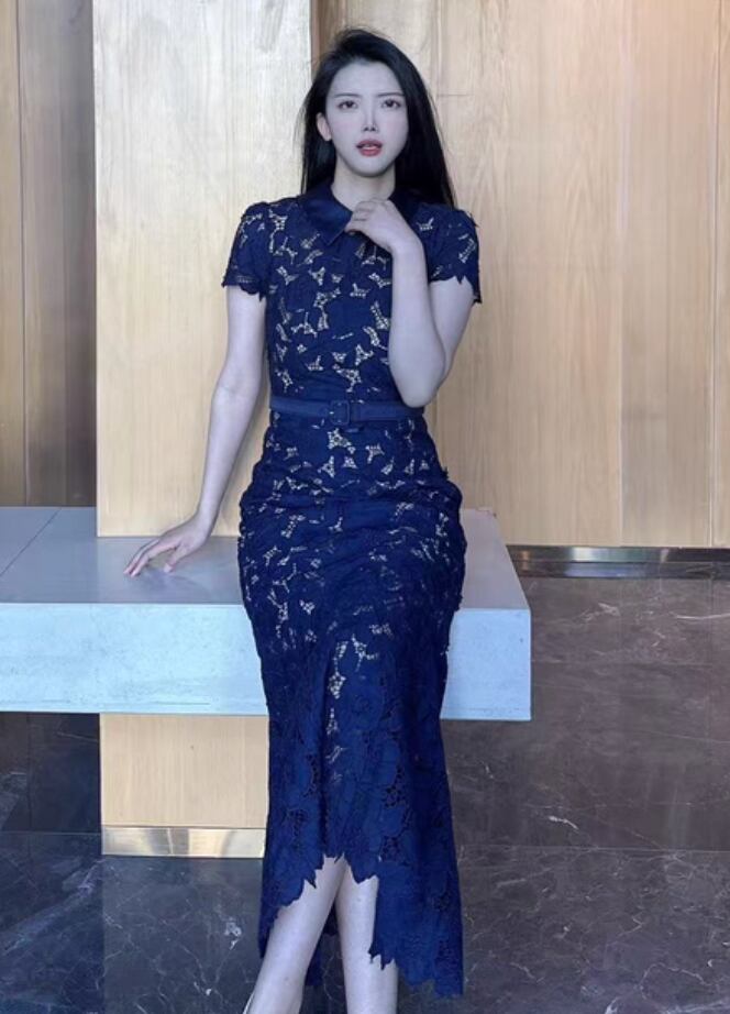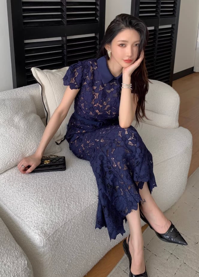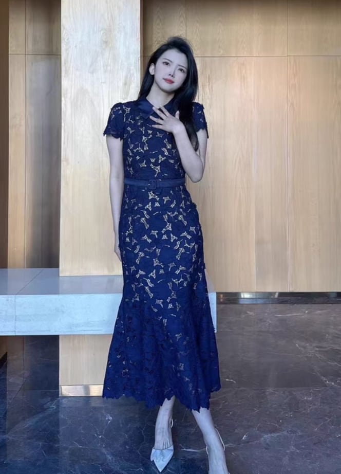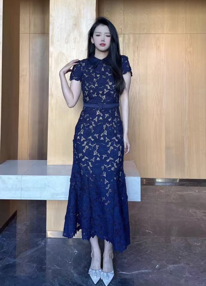 【動画あり】ネイビーブルーフィッシュテール上品フラワードレス