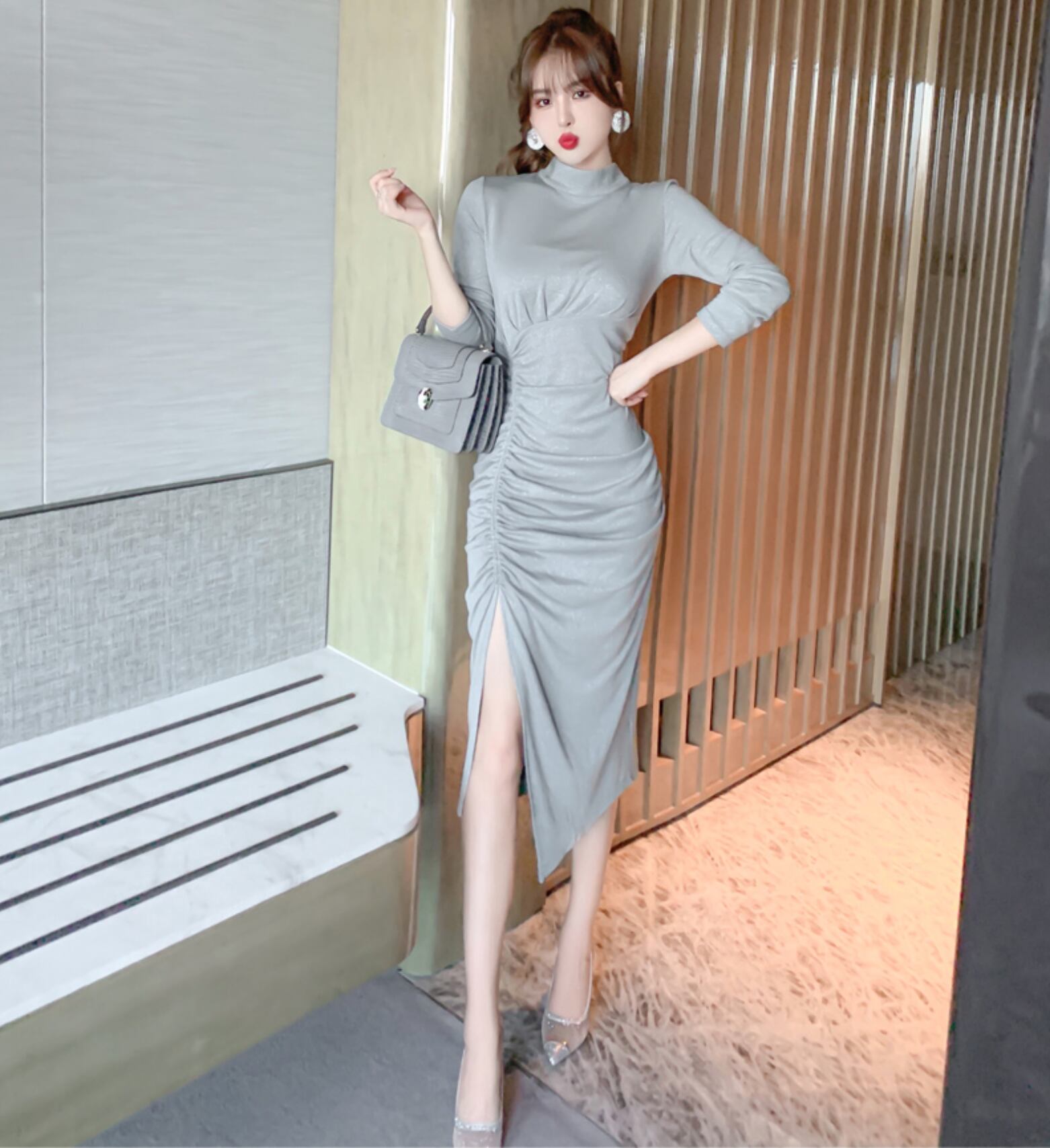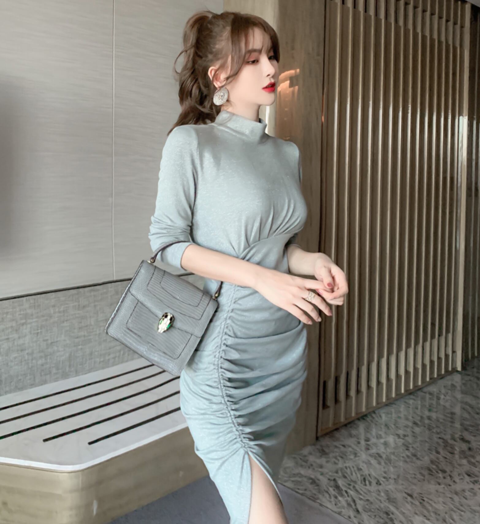 【動画あり】ラメ加工サイドカシュクール美シルエットハイネックワンピース