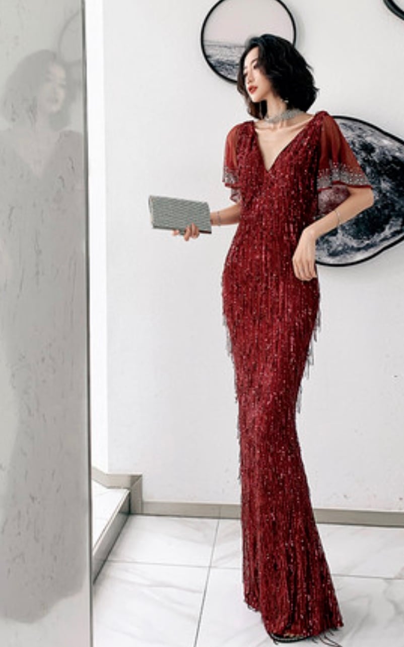 Vネックスパンコールフリンジシフォンドレス 4色展開