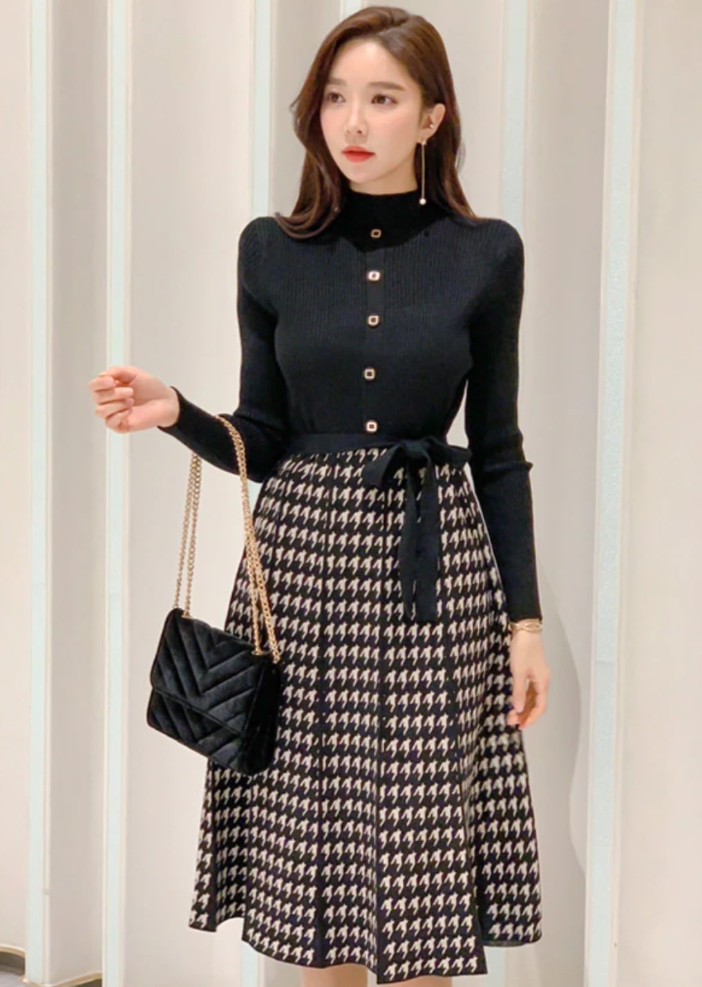 千鳥格子柄ハイネックドッキングニットワンピース