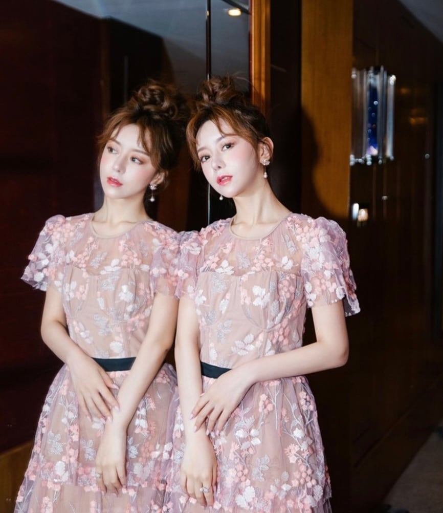 ベビーピンクフラワー刺繍シースルーワンピース