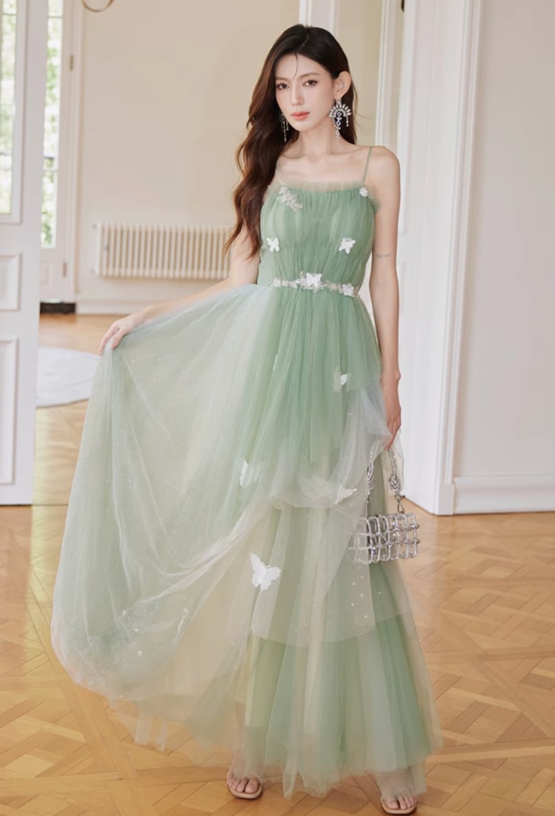 【動画あり】バタフライミントグリーンシフォンロングドレス