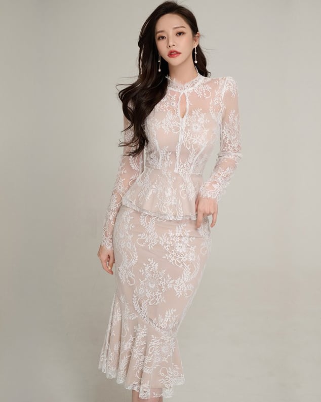 シースルーヌーディーレースマーメイドミディセットアップ 2色展開
