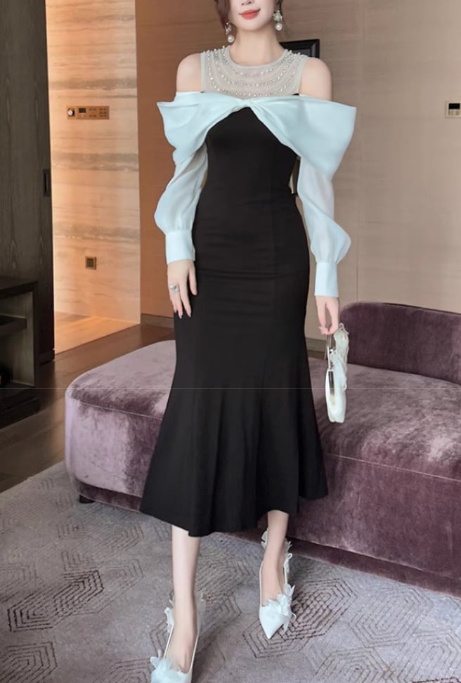 【動画あり】ビジューネックカットオフショルバイカラーワンピース